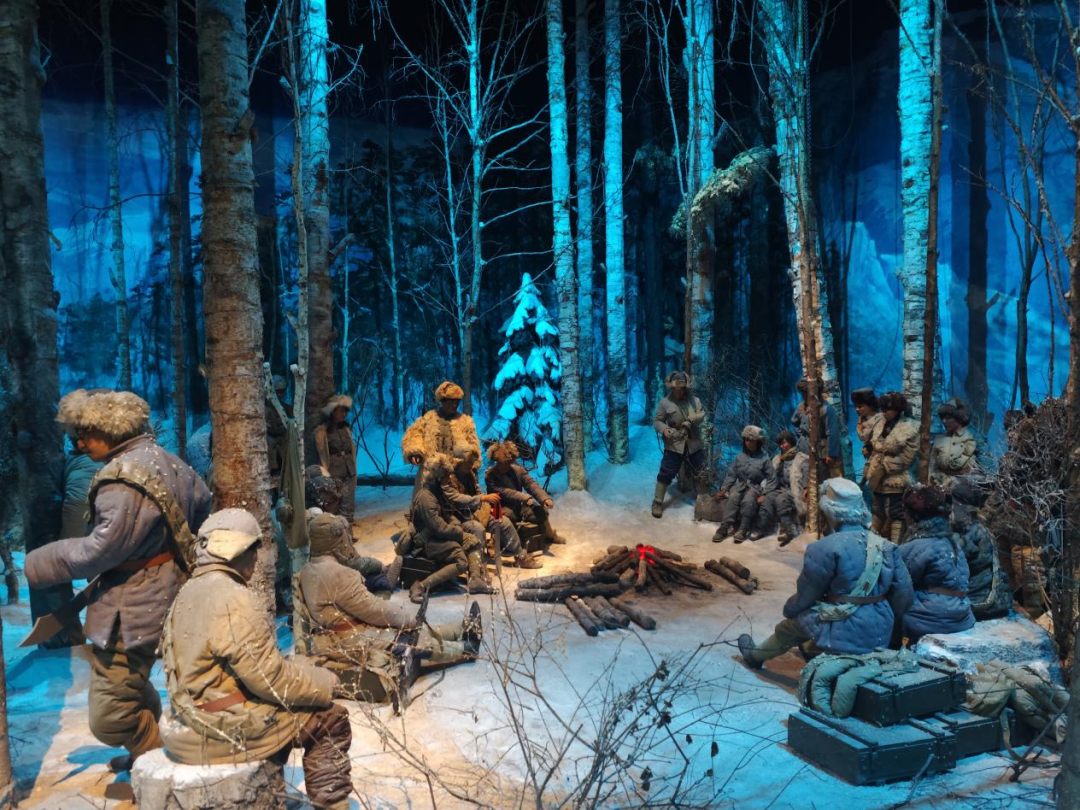 树林里积雪覆盖,林间小径上留着深浅不一的脚印,不远处的木屋外,几名战士围坐在篝火旁,手中握着简陋的大刀、老旧的步枪,眼神却如寒星般坚定,这是博物馆还原的东北抗联战斗场景。正如李兆麟创作的《露营之歌》所言,“朔风怒吼,大雪飞扬,征马踟蹰,冷气侵人夜难眠。火烤胸前暖,风吹背后寒”,没有真实的风雪,却让我仿佛置身于零下三四十摄氏度的寒冬,感受到了那份深入骨髓的艰苦与执着。